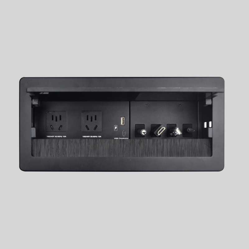 JS-Z400自收式接線盒提供了一個整潔、緊湊、簡單的連接解決方案,接線盒采用掀蓋式結構設計,使用時掀起內面板,各種線纜及接口展現出來;線纜采用自收式設計,使用時直接拉出線纜連接后即可使用,使用完畢線纜可自動收回接線盒內,實現了開會簡單入手、閉會就走,使整個會議桌面整潔、有序。